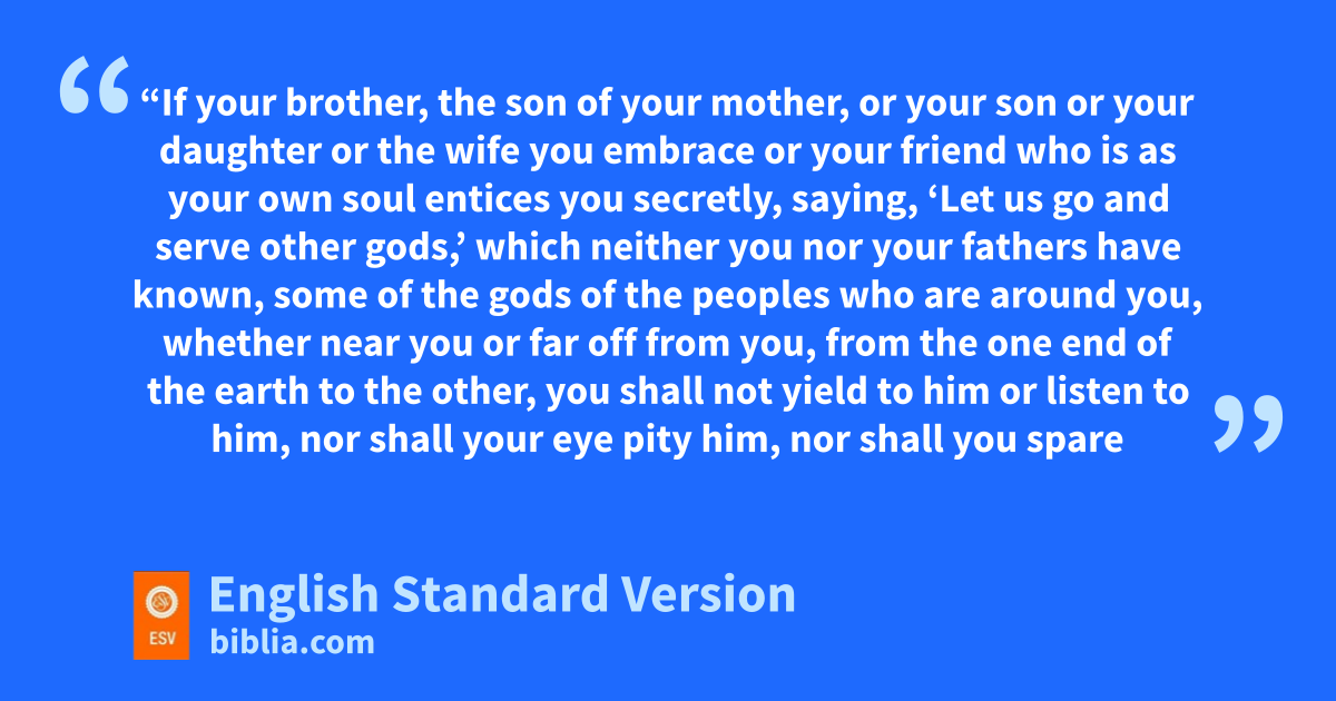 6 x“If your brother, the son of your mother, or your son or your daughter or ythe wife you embrace2 or your friend zwho is as your own soul entices you secretly, saying, ‘Let us go and serve other gods,’ awhich neither you nor your fathers have known, 7 some bof the gods of the peoples who are around you, whether near you or far off from you, from the one end of the earth to the other, 8 you shall cnot yield to him or listen to him, nor dshall your eye pity him, nor shall you spare him, nor shall you conceal him. 9 But you shall kill him. eYour hand shall be first against him to put him to death, and afterward the hand of all the people. 10 fYou shall stone him to death with stones, because he sought to draw you away from the Lord your God, who brought you out of the land of Egypt, out of the house of slavery. 11 And gall Israel shall hear and fear and never again do any such wickedness as this among you.