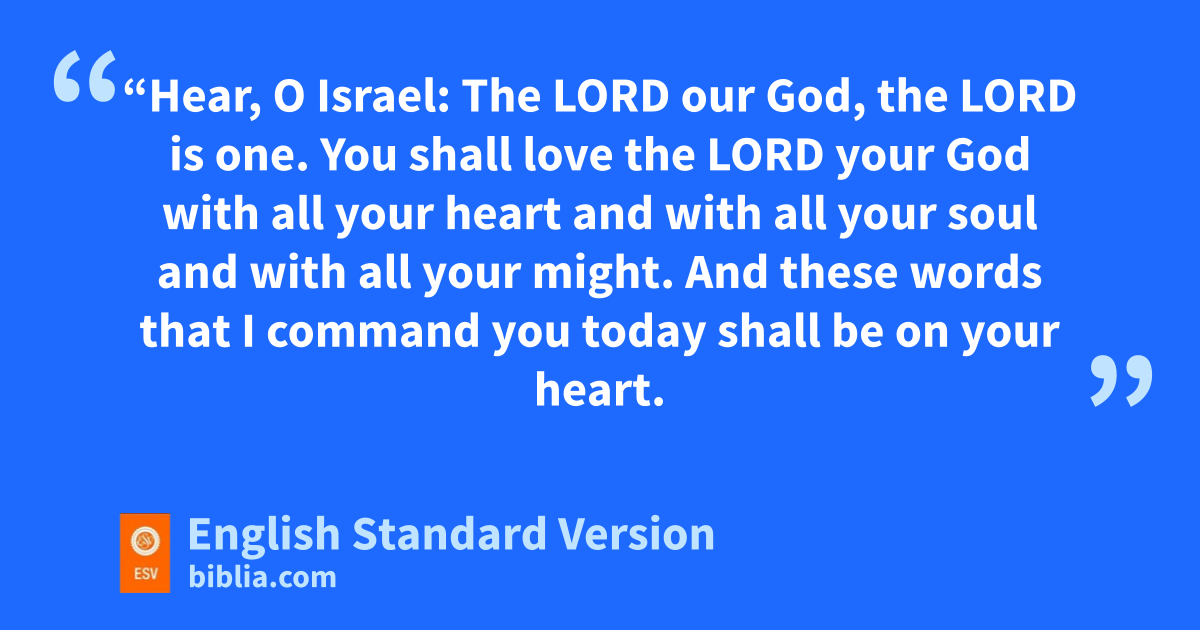 4 “Hear, O Israel: dThe Lord our God, the Lord is one.2 5 You eshall love the Lord your God with all your heart and with all your soul and with all your might. 6 And fthese words that I command you today shall be on your heart. 7 gYou shall teach them diligently to your children, and shall talk of them when you sit in your house, and when you walk by the way, and when you lie down, and when you rise. 8 hYou shall bind them as a sign on your hand, and they shall be as frontlets between your eyes. 9 iYou shall write them on the doorposts of your house and on your gates.