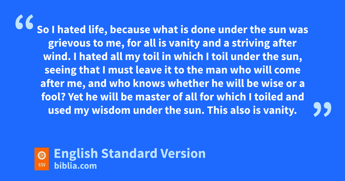 18 I hated yall my toil in which I toil under the sun, seeing that I must zleave it to the man who will come after me, 19 and who knows whether he will be wise or a fool? Yet he will be master of all for which I toiled and used my wisdom under the sun. This also is vanity. 20 So I aturned about and gave my heart up to despair bover all the toil of my labors under the sun, 21 because sometimes a person who has toiled with wisdom and knowledge and skill must leave everything to be enjoyed by someone who did not toil for it. This also is vanity and a great evil. 22 What has a man from call the toil and striving of heart with which he toils beneath the sun? 23 For dall his days are full of sorrow, and his ework is a vexation. Even in the night his heart does not rest. This also is vanity.