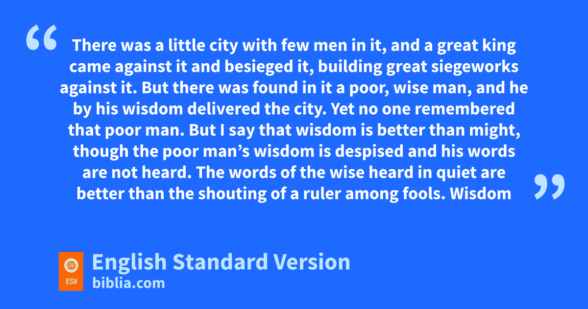 13 I have also seen this example of wisdom under the sun, and it seemed great to me. 14 There was a little city with few men in it, and a great king came against it and besieged it, building great siegeworks against it. 15 But there was found in it za poor, wise man, and he by his awisdom delivered the city. Yet no one remembered that poor man. 16 But I say that bwisdom is better than might, though cthe poor man’s wisdom is despised and his words are not heard.