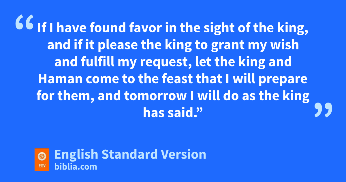 5 yOn the third day Esther put on her royal robes and stood in zthe inner court of the king’s palace, in front of the king’s quarters, while the king was sitting on his royal throne inside the throne room opposite the entrance to the palace. 2 And when the king saw Queen Esther standing in the court, ashe won favor in his sight, band he held out to Esther the golden scepter that was in his hand. Then Esther approached and touched the tip of the scepter. 3 And the king said to her, “What is it, Queen Esther? What is your request? It shall be given you, even cto the half of my kingdom.” 4 And Esther said, “If it please the king,1 let the king and Haman come today to a feast that I have prepared for the king.” 5 Then the king said, “Bring Haman quickly, so that we may do as Esther has asked.” So the king and Haman came to the feast that Esther had prepared. 6 dAnd as they were drinking wine after the feast, the king said to Esther, e“What is your wish? It shall be granted you. And what is your request? cEven to the half of my kingdom, it shall be fulfilled.”2 7 Then Esther answered, “My wish and my request is: 8 fIf I have found favor in the sight of the king, and if it please the king3 to grant my wish and fulfill my request, let the king and Haman come to gthe feast that I will prepare for them, and tomorrow I will do as the king has said.”