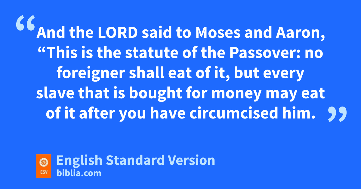 43 And the Lord said to Moses and Aaron, “This is the statute of the Passover: no foreigner shall eat of it, 44 but every slave2 that is fbought for money may eat of it after you have circumcised him. 45 gNo foreigner or hired worker may eat of it. 46 It shall be eaten in one house; you shall not take any of the flesh outside the house, and hyou shall not break any of its bones. 47 iAll the congregation of Israel shall keep it. 48 jIf a stranger shall sojourn with you and would keep the Passover to the Lord, let all his males be circumcised. Then he may come near and keep it; he kshall be as a native of the land. But no uncircumcised person shall eat of it. 49 There shall be lone law for the native and for the jstranger who sojourns among you.”