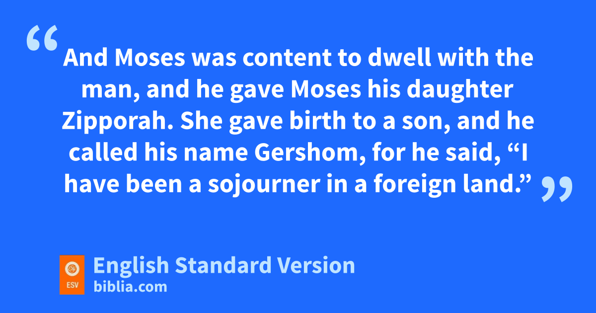 16 Now the gpriest of Midian had seven daughters, and hthey came and drew water and filled the troughs to water their father’s flock. 17 The shepherds came and drove them away, but Moses stood up and saved them, and iwatered their flock. 18 When they came home to their father jReuel, he said, “How is it that you have come home so soon today?” 19 They said, “An Egyptian delivered us out of the hand of the shepherds and even drew water for us and iwatered the flock.” 20 He said to his daughters, “Then where is he? Why have you left the man? Call him, that he may keat bread.” 21 And Moses was content to dwell with the man, and he gave Moses his daughter lZipporah. 22 She gave birth to a son, and he called his name mGershom, for he said, “I have been a nsojourner4 in a foreign land.”
