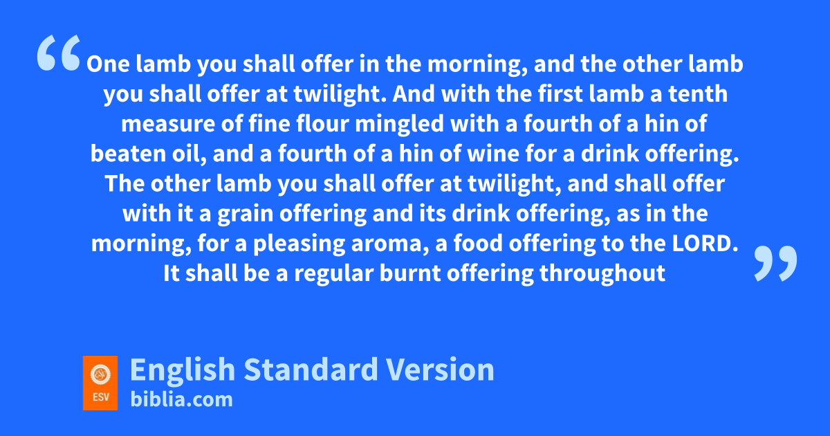 38 “Now this is what you shall offer on the altar: xtwo lambs a year old yday by day regularly. 39 One lamb you shall offer zin the morning, and the other lamb you shall offer aat twilight. 40 And with the first lamb a tenth measure3 of fine flour mingled with a fourth of a hin4 of beaten oil, and a fourth of a hin of wine for a drink offering. 41 The other lamb you shall offer aat twilight, and shall offer with it a grain offering and its drink offering, as bin the morning, for a cpleasing aroma, a food offering to the Lord. 42 It shall be a dregular burnt offering throughout your generations at the entrance of the tent of meeting before the Lord, ewhere I will meet with you, to speak to you there. 43 There I will meet with the people of Israel, and it shall be fsanctified by my glory. 44 I will consecrate the tent of meeting and the altar. gAaron also and his sons I will consecrate to serve me as priests. 45 hI will dwell among the people of Israel and will be their God. 46 And they shall know that iI am the Lord their God, who brought them out of the land of Egypt that I might dwell among them. I am the Lord their God.