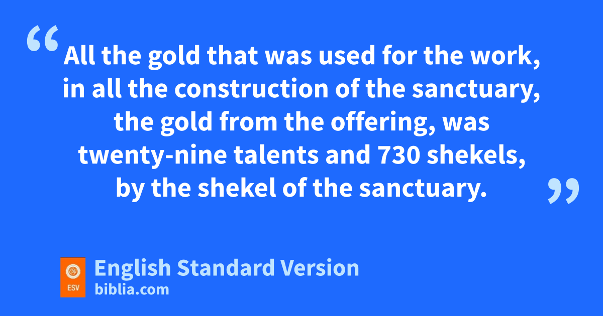 24 All the gold that was used for the work, in all the construction of the sanctuary, the gold from the offering, was twenty-nine talents and 730 shekels,2 by gthe shekel of the sanctuary. 25 The silver from those of the congregation who were recorded was a hundred talents and 1,775 shekels, by the shekel of the sanctuary: 26 a gbeka3 a head (that is, half a shekel, by the shekel of the sanctuary), for everyone who was listed in the records, from twenty years old and upward, for h603,550 men. 27 The hundred talents of silver were for casting the ibases of the sanctuary and the bases of the veil; a hundred bases for the hundred talents, a talent a base. 28 And of the 1,775 shekels he made hooks for the pillars and overlaid their capitals and made fillets for them. 29 The bronze that was offered was seventy talents and 2,400 shekels; 30 with it he made the jbases for the entrance of the tent of meeting, kthe bronze altar and the bronze grating for it and all the utensils of the altar, 31 the lbases around the court, and the mbases of the gate of the court, all the npegs of the tabernacle, and all the pegs around the court.