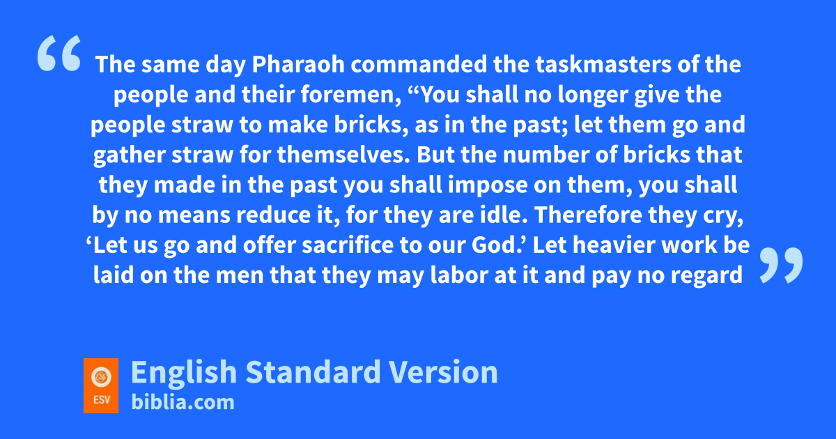 5 Afterward Moses and Aaron went and said to Pharaoh, “Thus says the Lord, the God of Israel, ‘Let my people go, that they may hold ta feast to me in the wilderness.’ ” 2 But Pharaoh said, u“Who is the Lord, that I should obey his voice and let Israel go? I do not know the Lord, and moreover, vI will not let Israel go.” 3 Then they said, “The wGod of the Hebrews has met with us. Please let us go a three days’ journey into the wilderness that we may sacrifice to the Lord our God, lest he fall upon us with pestilence or with the sword.” 4 But the king of Egypt said to them, “Moses and Aaron, why do you take the people away from their work? Get back to your xburdens.” 5 And Pharaoh said, “Behold, ythe people of the land are now many,1 and you make them rest from their burdens!” 6 The same day Pharaoh commanded the ztaskmasters of the people and their aforemen, 7 “You shall no longer give the people straw to make bricks, as in the past; let them go and gather straw for themselves. 8 But the number of bricks that they made in the past you shall impose on them, you shall by no means reduce it, for they are idle. Therefore they cry, ‘Let us go and offer sacrifice to our God.’ 9 Let heavier work be laid on the men that they may labor at it and pay no regard to lying words.”