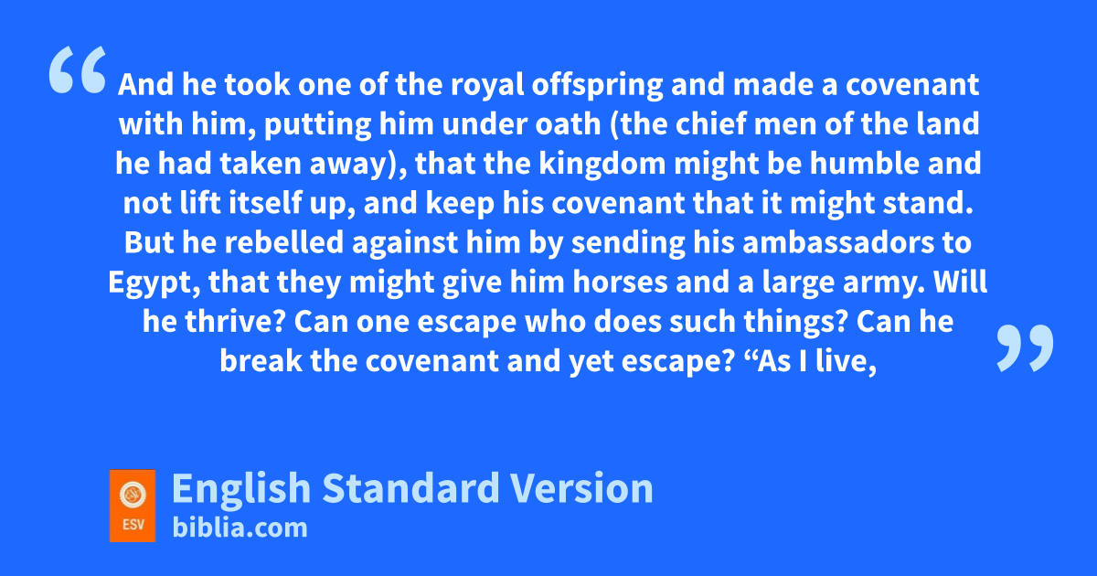 11 Then the word of the Lord came to me: 12 “Say now to pthe rebellious house, qDo you not know what these things mean? Tell them, behold, rthe king of Babylon came to Jerusalem, and took her king and her princes and brought them to him to Babylon. 13 sAnd he took one of the royal offspring2 tand made a covenant with him, uputting him under oath (vthe chief men of the land he had taken away), 14 that the kingdom might be humble and not lift itself up, and keep his covenant that it might stand. 15 wBut he rebelled against him by sending his ambassadors xto Egypt, that they might give him horses and a large army. yWill he thrive? Can one escape who does such things? Can he zbreak the covenant and yet escape?