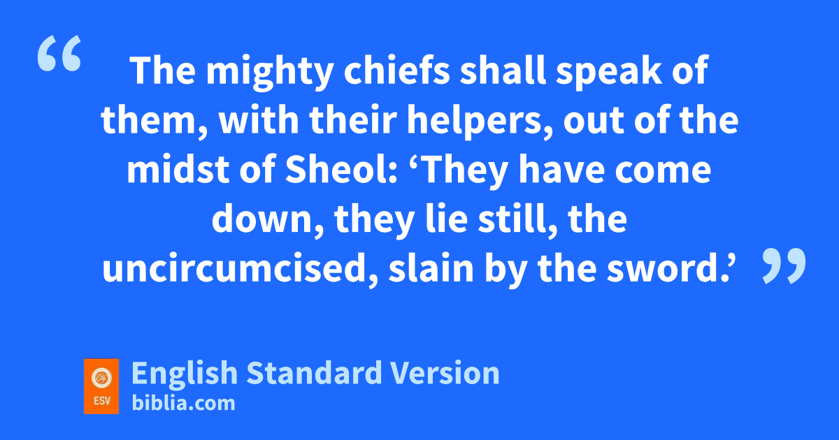 20 They shall fall amid those owho are slain by the sword. Egypt4 is delivered to the sword; drag her away, and pall her multitudes. 21 The mighty chiefs qshall speak of them, rwith their helpers, out of the midst of Sheol: ‘They have come down, they lie still, sthe uncircumcised, oslain by the sword.’