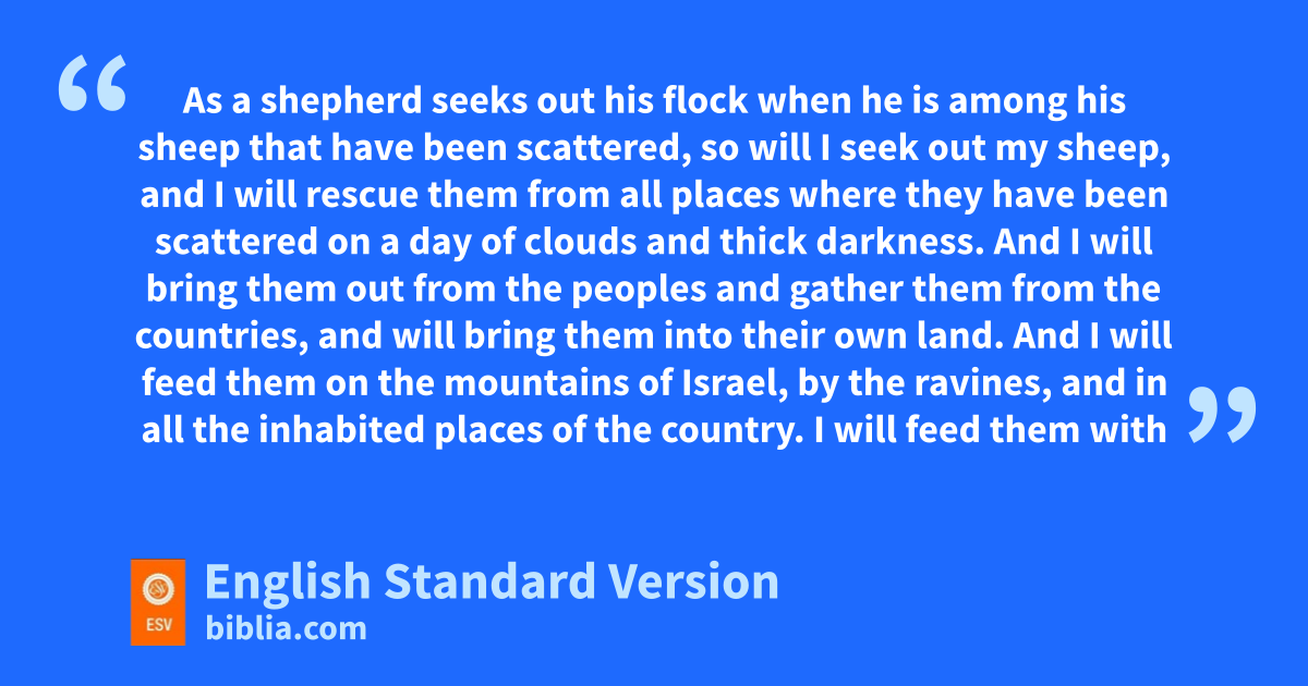 11 “For thus says the Lord God: wBehold, I, I xmyself will search for my sheep and will seek them out. 12 As a shepherd seeks out his flock when he is among his sheep that have been scattered, so will I seek out my sheep, and I will rescue them from all places where they have been scattered on ya day of clouds and zthick darkness. 13 And I will bring them out from the peoples aand gather them from the countries, and will bring them into their own land. And I will feed them on bthe mountains of Israel, by the ravines, and in all the inhabited places of the country. 14 cI will feed them with good pasture, and on the mountain heights of Israel shall be their grazing land. dThere they shall lie down in good grazing land, and on rich pasture they shall feed on the mountains of Israel. 15 eI myself will be the shepherd of my sheep, dand I myself will make them lie down, declares the Lord God. 16 fI will seek the lost, gand I will bring back the strayed, and I will bind up the injured, and I will strengthen the weak, and hthe fat and the strong I will destroy.1 I will feed them in justice.