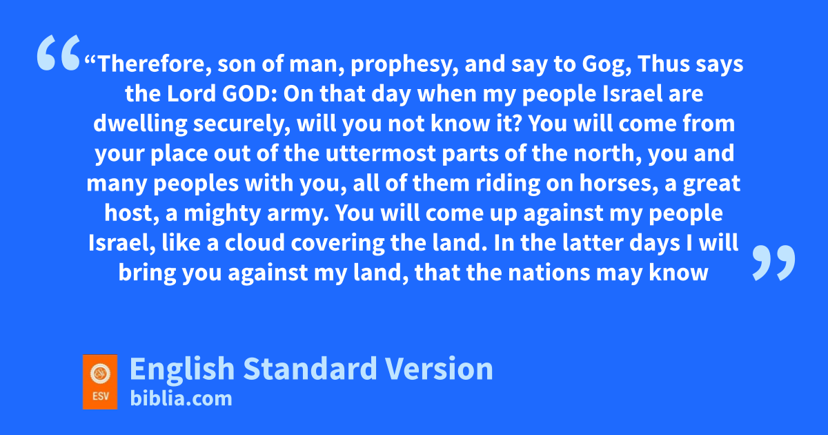 14 “Therefore, rson of man, prophesy, and say to sGog, Thus says the Lord God: On that day when my people Israel are gdwelling securely, twill you not know it? 15 You will come from your place out of uthe uttermost parts of the north, you and vmany peoples with you, wall of them riding on horses, a great host, a mighty army. 16 You will come up against my people Israel, ilike a cloud covering the land. xIn the latter days I will bring you against my land, that the nations may know me, when through you, O Gog, yI vindicate my holiness before their eyes.