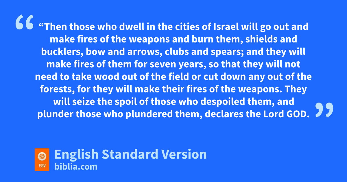 9 “Then those who dwell in the cities of Israel will go out and pmake fires of the weapons and burn them, shields and bucklers, bow and arrows, qclubs3 and spears; and they will make fires of them for seven years, 10 so that they will not need to take wood out of the field or cut down any out of the forests, for pthey will make their fires of the weapons. rThey will seize the spoil of those who despoiled them, and plunder those who plundered them, declares the Lord God.