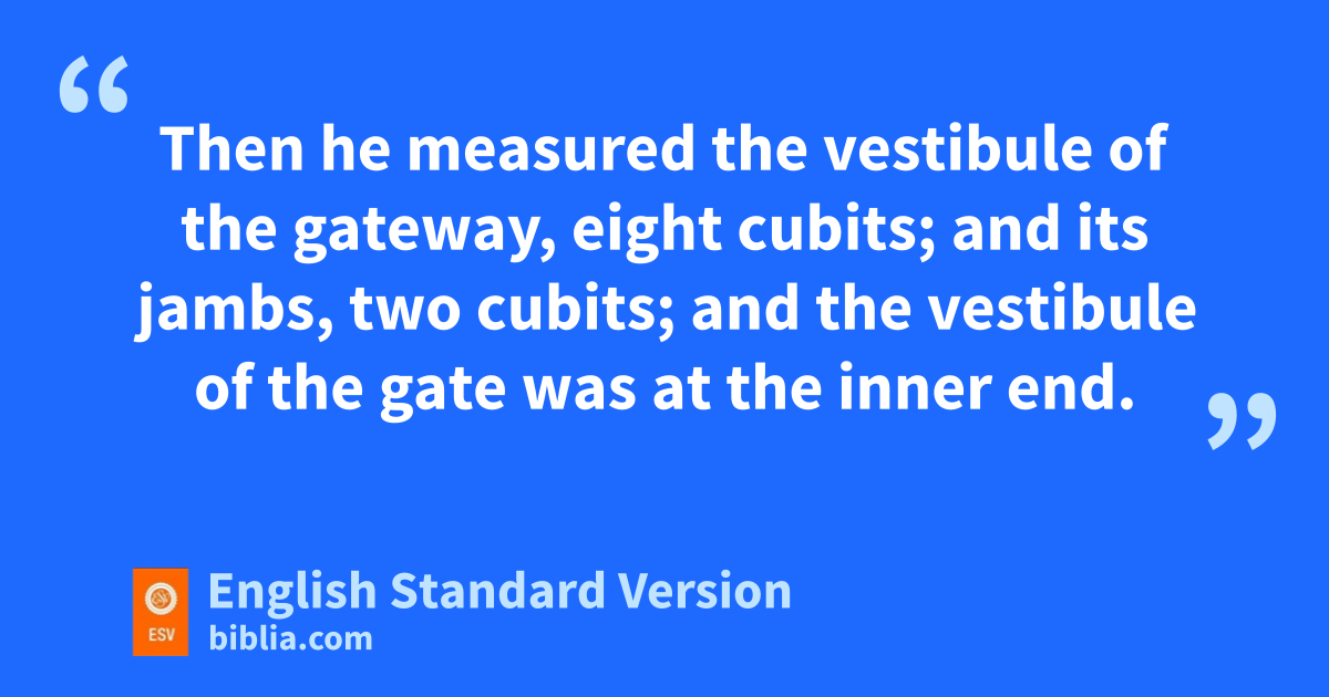48 Then he brought me to jthe vestibule of the temple and measured the kjambs of the vestibule, five cubits on either side. And the breadth of the gate was fourteen cubits, and the sidewalls of the gate15 were three cubits on either side. 49 lThe length of the vestibule was twenty cubits, and the breadth twelve16 cubits, and people would go up to it by ten steps.17 And there were pillars beside the jambs, one on either side.