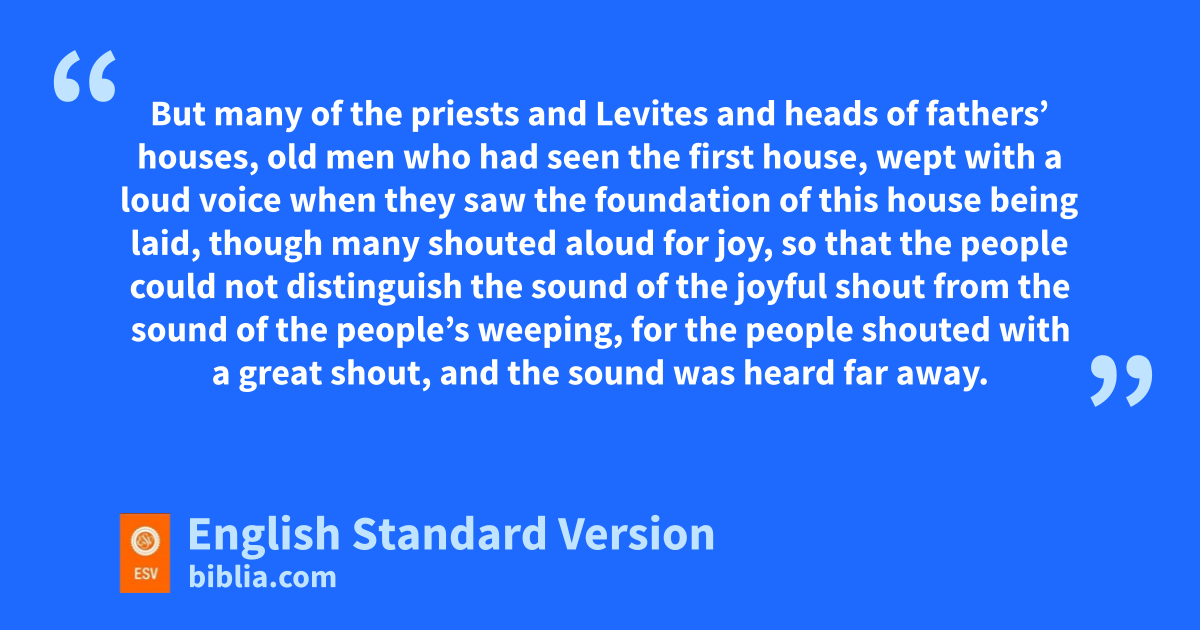 And all the people shouted with a great shout when they praised the Lord, because the foundation of the house of the Lord was laid. 12 But many of the priests and Levites and heads of fathers’ houses, fold men who had seen the first house, wept with a loud voice when they saw the foundation of this house being laid, though many shouted aloud for joy, 13 so that the people could not distinguish the sound of the joyful shout from the sound of the people’s weeping, for the people shouted with a great shout, and the sound was heard far away.