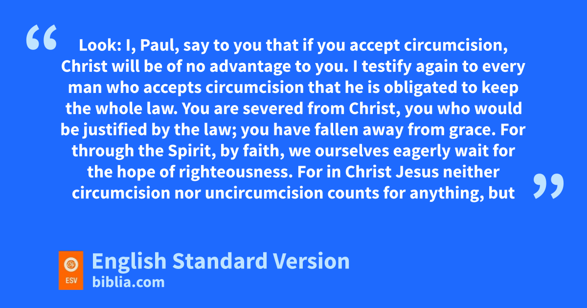 2 Look: I, Paul, say to you that xif you accept circumcision, yChrist will be of no advantage to you. 3 I testify again to every man who accepts circumcision that zhe is obligated to keep the whole law. 4 You are asevered from Christ, byou who would be justified1 by the law; cyou have fallen away from grace. 5 For through the Spirit, by faith, we ourselves eagerly dwait for the hope of righteousness. 6 For in Christ Jesus eneither circumcision nor uncircumcision counts for anything, but fonly faith working through love.