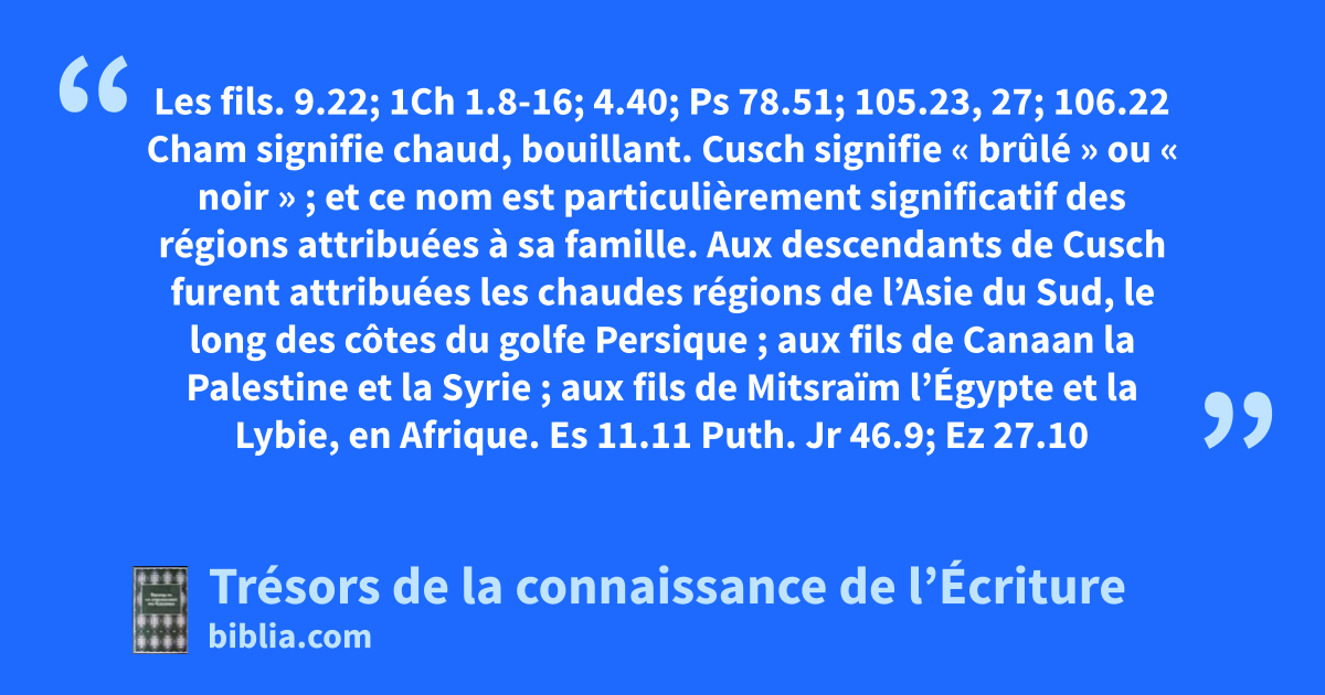 Les fils. 9.22; 1Ch 1.8-16; 4.40; Ps 78.51; 105.23, 27; 106.22 Cham signifie chaud, bouillant. Cusch signifie « brûlé » ou « noir » ; et ce nom est particulièrement significatif des régions attribuées à sa famille. Aux descendants de Cusch furent attribuées les chaudes régions de l’Asie du Sud, le long des côtes du golfe Persique ; aux fils de Canaan la Palestine et la Syrie ; aux fils de Mitsraïm l’Égypte et la Lybie, en Afrique. Es 11.11 Puth. Jr 46.9; Ez 27.10