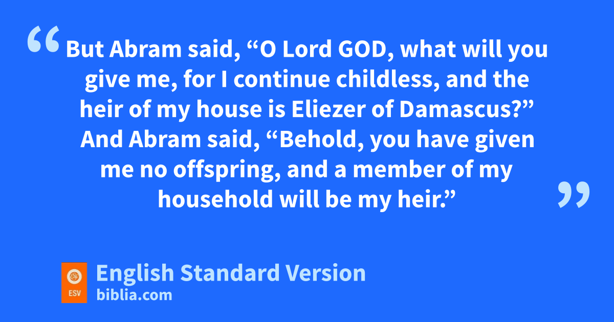 15 After these things the word of the Lord came to Abram in a vision: c“Fear not, Abram, I am dyour shield; your reward shall be very great.” 2 But Abram said, “O Lord God, what will you give me, for I continue1 childless, and the heir of my house is Eliezer of Damascus?” 3 And Abram said, “Behold, you have given me no offspring, and ea member of my household will be my heir.” 4 And behold, the word of the Lord came to him: “This man shall not be your heir; fyour very own son2 shall be your heir.” 5 And he brought him outside and said, “Look toward heaven, and gnumber the stars, if you are able to number them.” Then he said to him, h“So shall your offspring be.” 6 And ihe believed the Lord, and jhe counted it to him as righteousness.