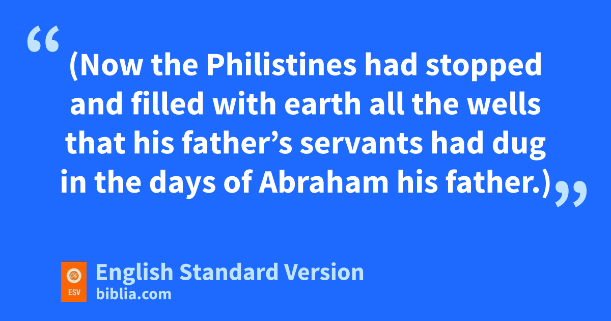 17 So Isaac departed from there and encamped in the Valley of Gerar and settled there. 18 And Isaac dug again the wells of water that had been dug in the days of Abraham his father, which the Philistines had stopped after the death of Abraham. And mhe gave them the names that his father had given them. 19 But when Isaac’s servants dug in the valley and found there a well of spring water, 20 the herdsmen of Gerar nquarreled with Isaac’s herdsmen, saying, “The water is ours.” So he called the name of the well Esek,2 because they contended with him. 21 Then they dug another well, and they quarreled over that also, so he called its name Sitnah.3 22 And he moved from there and dug another well, and they did not quarrel over it. So he called its name Rehoboth,4 saying, “For now the Lord has made room for us, and we shall be fruitful in the land.”