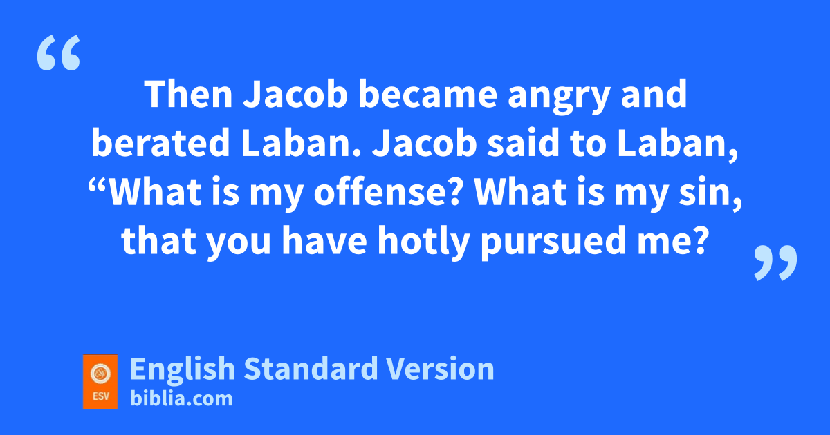 36 Then Jacob became angry and berated Laban. Jacob said to Laban, “What is my offense? What is my sin, that you have hotly pursued me? 37 For you have felt through all my goods; what have you found of all your household goods? Set it here before my kinsmen and byour kinsmen, that they may decide between us two. 38 These twenty years I have been with you. Your ewes and your female goats have not miscarried, and I have not eaten the rams of your flocks. 39 What was torn by wild beasts I did not bring to you. I bore the loss of it myself. cFrom my hand you required it, whether stolen by day or stolen by night. 40 There I was: by day the heat consumed me, and the cold by night, and my sleep fled from my eyes. 41 These twenty years I have been in your house. dI served you fourteen years for your two daughters, and six years for your flock, and eyou have changed my wages ten times. 42 fIf the God of my father, the God of Abraham and the gFear of Isaac, had not been on my side, surely now you would have sent me away empty-handed. hGod saw my affliction and the labor of my hands and irebuked you last night.”