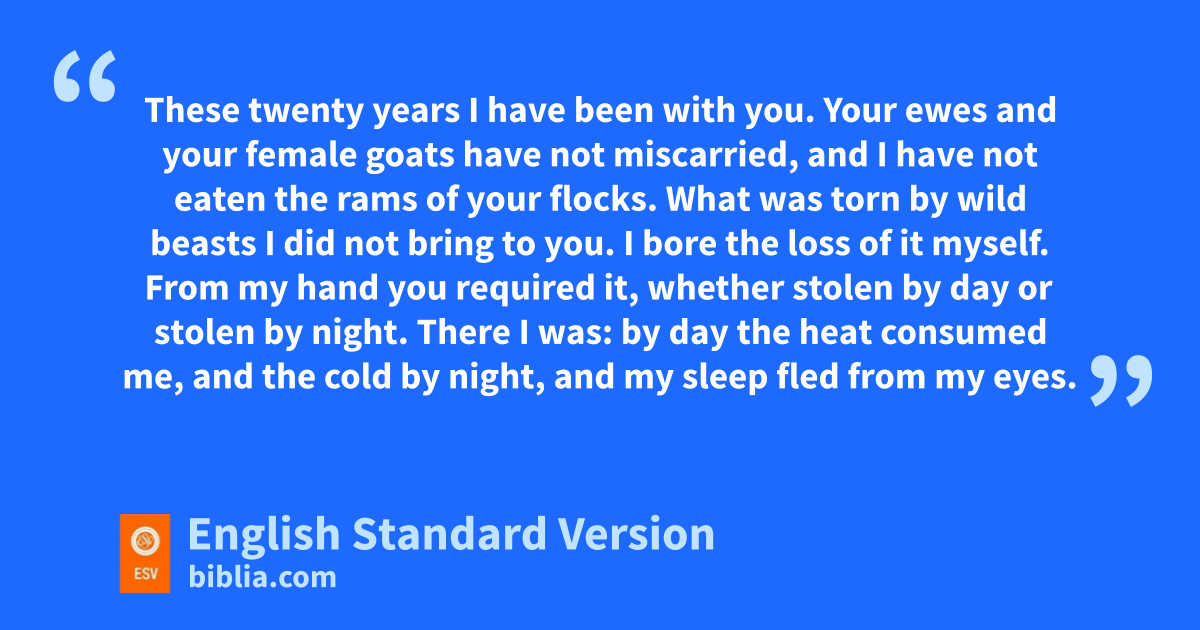 36 Then Jacob became angry and berated Laban. Jacob said to Laban, “What is my offense? What is my sin, that you have hotly pursued me? 37 For you have felt through all my goods; what have you found of all your household goods? Set it here before my kinsmen and byour kinsmen, that they may decide between us two. 38 These twenty years I have been with you. Your ewes and your female goats have not miscarried, and I have not eaten the rams of your flocks. 39 What was torn by wild beasts I did not bring to you. I bore the loss of it myself. cFrom my hand you required it, whether stolen by day or stolen by night. 40 There I was: by day the heat consumed me, and the cold by night, and my sleep fled from my eyes. 41 These twenty years I have been in your house. dI served you fourteen years for your two daughters, and six years for your flock, and eyou have changed my wages ten times. 42 fIf the God of my father, the God of Abraham and the gFear of Isaac, had not been on my side, surely now you would have sent me away empty-handed. hGod saw my affliction and the labor of my hands and irebuked you last night.”