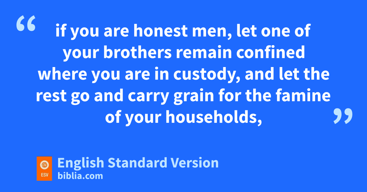 18 On the third day Joseph said to them, “Do this and you will live, vfor I fear God: 19 if you are honest men, let one of your brothers remain confined where you are in custody, and let the rest go and carry wgrain for the famine of your households, 20 and xbring your youngest brother to me. So your words will be verified, and you shall not die.” And they did so. 21 Then they said to one another, y“In truth we are guilty concerning our brother, in that we saw the distress of his soul, when he begged us and we did not listen. That is why this distress has come upon us.” 22 And Reuben answered them, z“Did I not tell you not to sin against the boy? But you did not listen. So now athere comes a reckoning for his blood.” 23 They did not know that Joseph understood them, for there was an interpreter between them. 24 Then he turned away from them and bwept. And he returned to them and spoke to them. And he took Simeon from them and bound him before their eyes. 25 cAnd Joseph gave orders to fill their bags with grain, and to replace every man’s money in his sack, and to give them provisions for the journey. This was done for them.