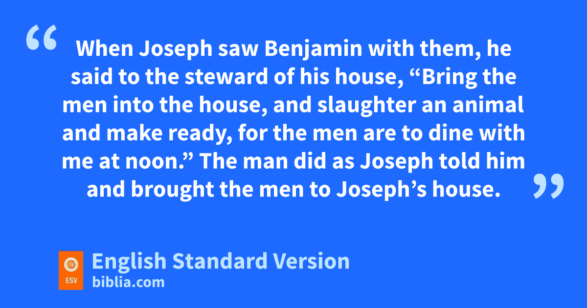 16 When Joseph saw Benjamin with them, he said to the zsteward of his house, “Bring the men into the house, and slaughter an animal and make ready, for the men are to dine with me at noon.” 17 The man did as Joseph told him and brought the men to Joseph’s house. 18 And the men were afraid because they were brought to Joseph’s house, and they said, “It is because of the money, which was replaced in our sacks the first time, that we are brought in, so that he may assault us and fall upon us to make us servants and seize our donkeys.” 19 So they went up to the steward of Joseph’s house and spoke with him at the door of the house, 20 and said, a“Oh, my lord, bwe came down the first time to buy food. 21 And cwhen we came to the lodging place we opened our sacks, and there was each man’s money in the mouth of his sack, our money in full weight. So we have brought it again with us, 22 and we have brought other money down with us to buy food. We do not know who put our money in our sacks.” 23 He replied, “Peace to you, do not be afraid. Your God and the God of your father has put treasure in your sacks for you. I received your money.” Then he brought Simeon out to them. 24 And when the man had brought the men into Joseph’s house and dgiven them water, and they had washed their feet, and when he had given their donkeys fodder, 25 they prepared ethe present for Joseph’s coming at noon, for they heard that they should eat bread there.
