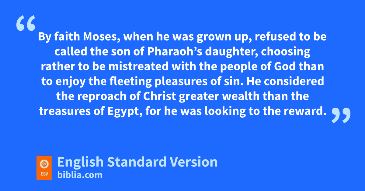 23 By faith qMoses, when he was born, was hidden for three months by his parents, because they saw that the child was beautiful, and they were not afraid of rthe king’s edict. 24 By faith Moses, when he was grown up, srefused to be called the son of Pharaoh’s daughter, 25 tchoosing rather to be mistreated with the people of God than to enjoy uthe fleeting pleasures of sin. 26 vHe considered the reproach of Christ greater wealth than the treasures of Egypt, for he was looking to wthe reward. 27 By faith he xleft Egypt, ynot being afraid of the anger of the king, for he endured zas seeing him who is invisible. 28 By faith ahe kept the Passover and sprinkled the blood, so that the Destroyer of the firstborn might not touch them.