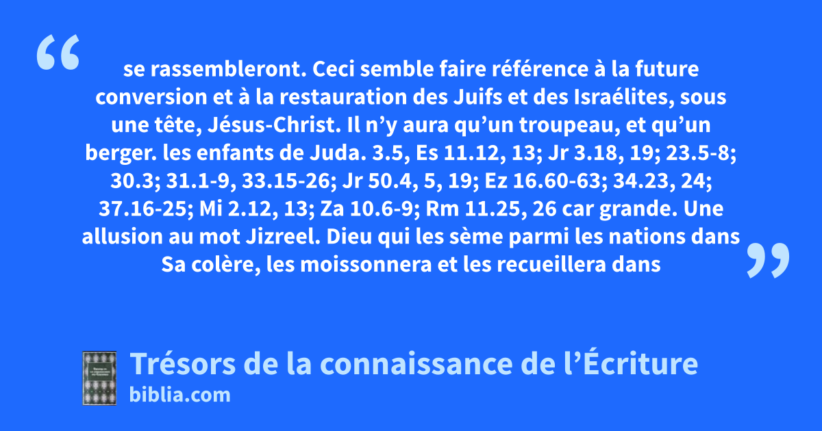 se rassembleront. Ceci semble faire référence à la future conversion et à la restauration des Juifs et des Israélites, sous une tête, Jésus-Christ. Il n’y aura qu’un troupeau, et qu’un berger. les enfants de Juda. 3.5, Es 11.12, 13; Jr 3.18, 19; 23.5-8; 30.3; 31.1-9, 33.15-26; Jr 50.4, 5, 19; Ez 16.60-63; 34.23, 24; 37.16-25; Mi 2.12, 13; Za 10.6-9; Rm 11.25, 26 car grande. Une allusion au mot Jizreel. Dieu qui les sème parmi les nations dans Sa colère, les moissonnera et les recueillera dans Sa miséricorde. 2.22, 23; Ps 22.28-31; 110.3; Rm 11.15