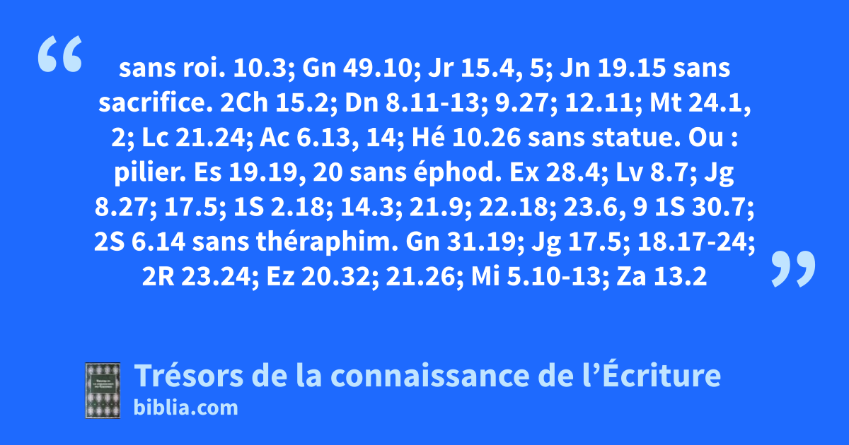 sans roi. 10.3; Gn 49.10; Jr 15.4, 5; Jn 19.15 sans sacrifice. 2Ch 15.2; Dn 8.11-13; 9.27; 12.11; Mt 24.1, 2; Lc 21.24; Ac 6.13, 14; Hé 10.26 sans statue. Ou : pilier. Es 19.19, 20 sans éphod. Ex 28.4; Lv 8.7; Jg 8.27; 17.5; 1S 2.18; 14.3; 21.9; 22.18; 23.6, 9 1S 30.7; 2S 6.14 sans théraphim. Gn 31.19; Jg 17.5; 18.17-24; 2R 23.24; Ez 20.32; 21.26; Mi 5.10-13; Za 13.2
