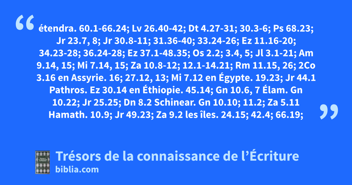 étendra. 60.1-66.24; Lv 26.40-42; Dt 4.27-31; 30.3-6; Ps 68.23; Jr 23.7, 8; Jr 30.8-11; 31.36-40; 33.24-26; Ez 11.16-20; 34.23-28; 36.24-28; Ez 37.1-48.35; Os 2.2; 3.4, 5; Jl 3.1-21; Am 9.14, 15; Mi 7.14, 15; Za 10.8-12; 12.1-14.21; Rm 11.15, 26; 2Co 3.16 en Assyrie. 16; 27.12, 13; Mi 7.12 en Égypte. 19.23; Jr 44.1 Pathros. Ez 30.14 en Éthiopie. 45.14; Gn 10.6, 7 Élam. Gn 10.22; Jr 25.25; Dn 8.2 Schinear. Gn 10.10; 11.2; Za 5.11 Hamath. 10.9; Jr 49.23; Za 9.2 les îles. 24.15; 42.4; 66.19; Gn 10.5; Jr 31.10; Ez 27.6; Dn 11.18; So 2.11