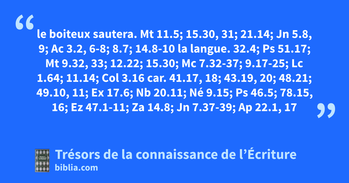 le boiteux sautera. Mt 11.5; 15.30, 31; 21.14; Jn 5.8, 9; Ac 3.2, 6-8; 8.7; 14.8-10 la langue. 32.4; Ps 51.17; Mt 9.32, 33; 12.22; 15.30; Mc 7.32-37; 9.17-25; Lc 1.64; 11.14; Col 3.16 car. 41.17, 18; 43.19, 20; 48.21; 49.10, 11; Ex 17.6; Nb 20.11; Né 9.15; Ps 46.5; 78.15, 16; Ez 47.1-11; Za 14.8; Jn 7.37-39; Ap 22.1, 17
