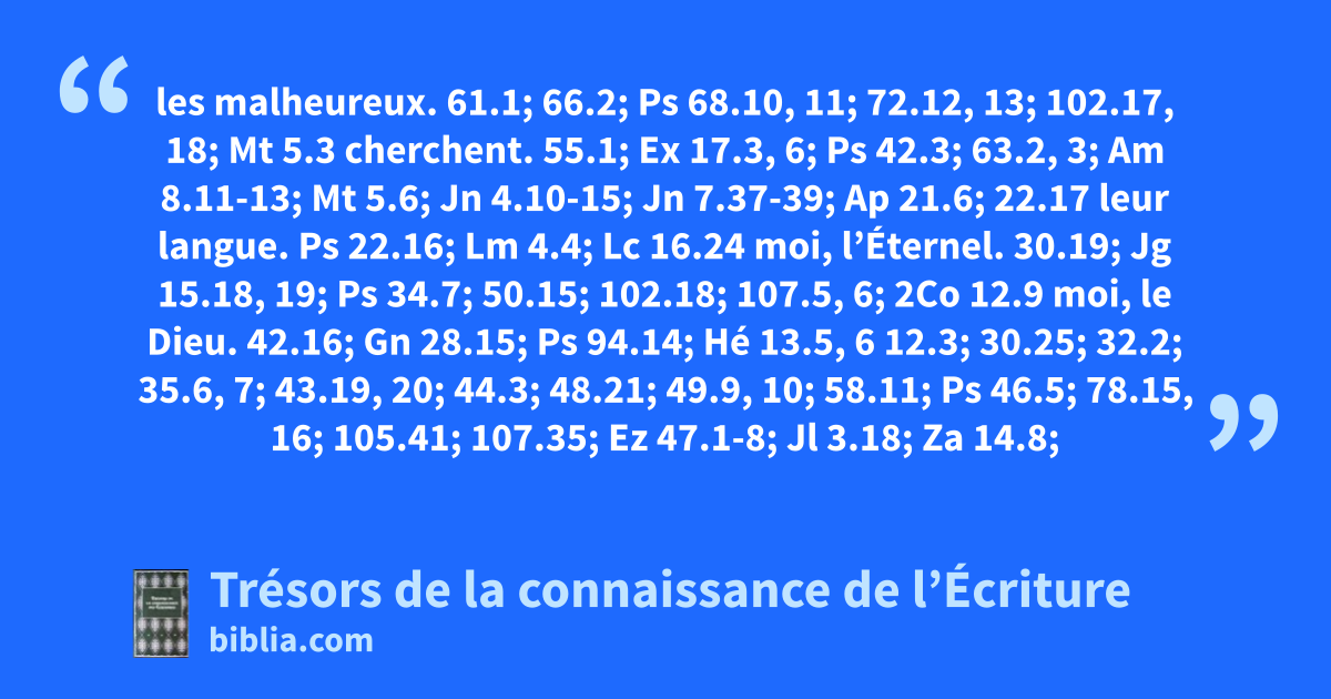 les malheureux. 61.1; 66.2; Ps 68.10, 11; 72.12, 13; 102.17, 18; Mt 5.3 cherchent. 55.1; Ex 17.3, 6; Ps 42.3; 63.2, 3; Am 8.11-13; Mt 5.6; Jn 4.10-15; Jn 7.37-39; Ap 21.6; 22.17 leur langue. Ps 22.16; Lm 4.4; Lc 16.24 moi, l’Éternel. 30.19; Jg 15.18, 19; Ps 34.7; 50.15; 102.18; 107.5, 6; 2Co 12.9 moi, le Dieu. 42.16; Gn 28.15; Ps 94.14; Hé 13.5, 6