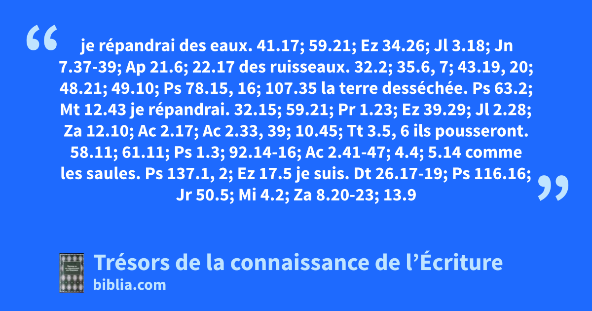 je répandrai des eaux. 41.17; 59.21; Ez 34.26; Jl 3.18; Jn 7.37-39; Ap 21.6; 22.17 des ruisseaux. 32.2; 35.6, 7; 43.19, 20; 48.21; 49.10; Ps 78.15, 16; 107.35 la terre desséchée. Ps 63.2; Mt 12.43 je répandrai. 32.15; 59.21; Pr 1.23; Ez 39.29; Jl 2.28; Za 12.10; Ac 2.17; Ac 2.33, 39; 10.45; Tt 3.5, 6
