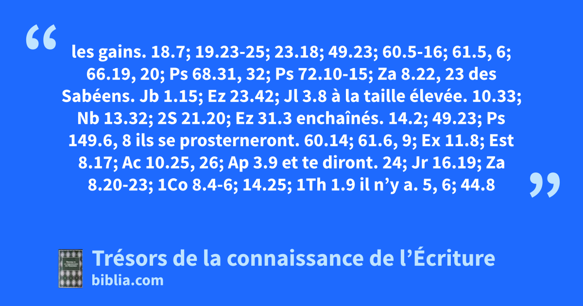 les gains. 18.7; 19.23-25; 23.18; 49.23; 60.5-16; 61.5, 6; 66.19, 20; Ps 68.31, 32; Ps 72.10-15; Za 8.22, 23 des Sabéens. Jb 1.15; Ez 23.42; Jl 3.8 à la taille élevée. 10.33; Nb 13.32; 2S 21.20; Ez 31.3 enchaînés. 14.2; 49.23; Ps 149.6, 8 ils se prosterneront. 60.14; 61.6, 9; Ex 11.8; Est 8.17; Ac 10.25, 26; Ap 3.9 et te diront. 24; Jr 16.19; Za 8.20-23; 1Co 8.4-6; 14.25; 1Th 1.9 il n’y a. 5, 6; 44.8
