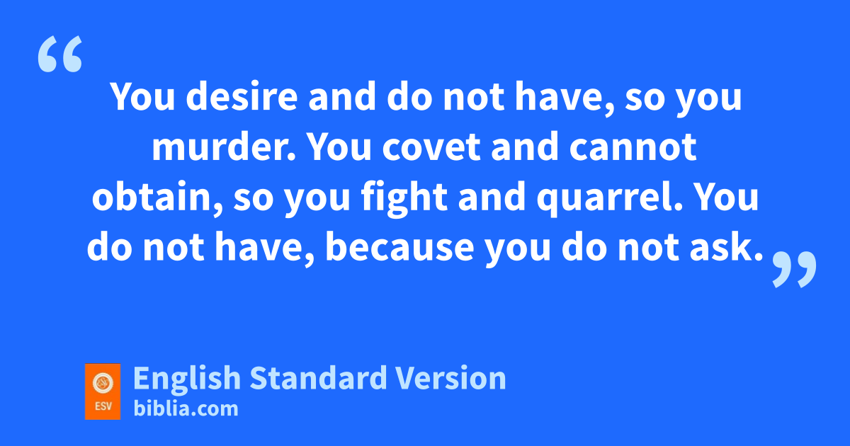 4 What causes quarrels and what causes fights among you? Is it not this, that your passions1 are yat war within you?2 2 You desire and do not have, so you murder. You covet and cannot obtain, so you fight and quarrel. You do not have, because you do not ask. 3 You ask and do not receive, because you ask zwrongly, to spend it on your passions. 4 aYou adulterous people!3 Do you not know that friendship with the world is enmity with God? bTherefore whoever wishes to be a friend of the world makes himself an enemy of God. 5 Or do you suppose it is to no purpose that the Scripture says, “He yearns jealously over the spirit cthat he has made to dwell in us”? 6 But dhe gives more grace. Therefore it says, e“God opposes the proud but dgives grace to the humble.” 7 Submit yourselves therefore to God. fResist the devil, and he will flee from you. 8 gDraw near to God, and he will draw near to you. hCleanse your hands, you sinners, and ipurify your hearts, jyou double-minded. 9 kBe wretched and mourn and weep. Let your laughter be turned to mourning and your joy to gloom. 10 lHumble yourselves before the Lord, and he will exalt you.