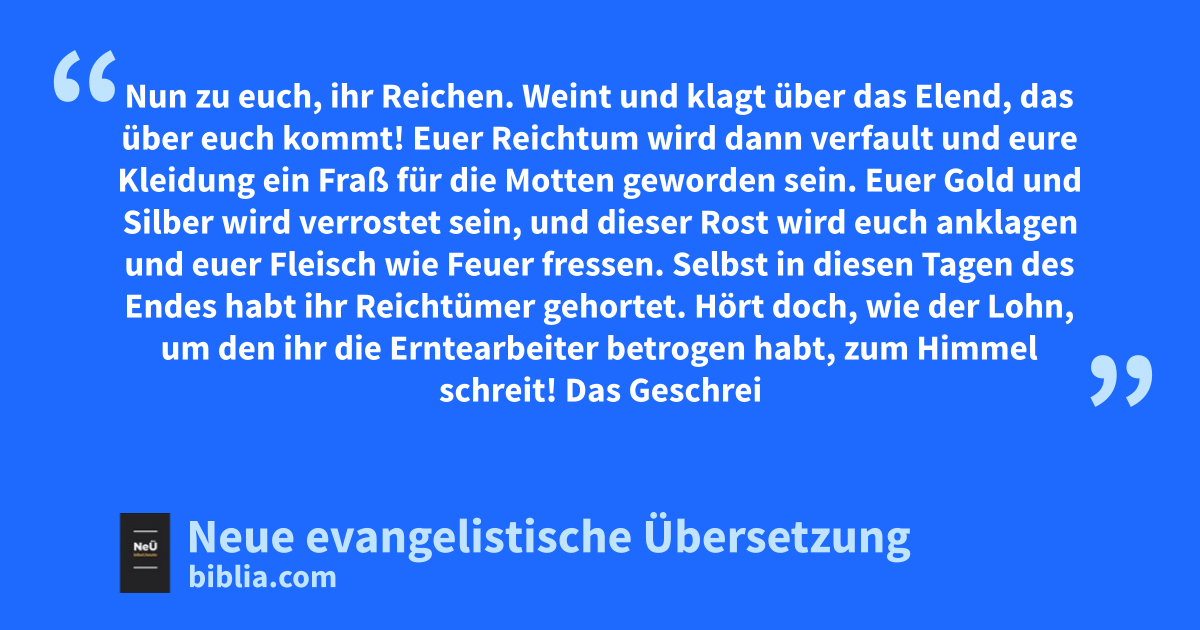 5 1 Nun zu euch, ihr Reichen. Weint und klagt über das Elend, das über euch kommt! 2 Euer Reichtum wird dann verfault und eure Kleidung ein Fraß für die Motten geworden sein. 3 Euer Gold und Silber wird verrostet sein, und dieser Rost wird euch anklagen und euer Fleisch wie Feuer fressen. Selbst in diesen Tagen des Endes* habt ihr Reichtümer gehortet. 4 Hört doch, wie der Lohn, um den ihr die Erntearbeiter betrogen habt, zum Himmel schreit! Das Geschrei der Arbeiter ist vor den Herrn, den Allmächtigen, gekommen. 5 Ihr habt allen Luxus auf der Erde genossen und euch noch am Tag eurer Schlachtung gemästet* . 6 Ihr habt den Unschuldigen verurteilt und zu Tode gebracht. Er hat sich nicht gewehrt.