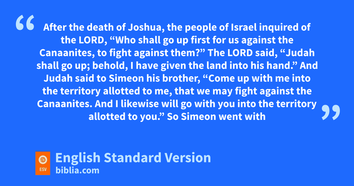 1 After the death of Joshua, the people of Israel ainquired of the Lord, b“Who shall go up first for us against the Canaanites, to fight against them?” 2 The Lord said, “Judah shall go up; behold, I have given the land into his hand.” 3 And Judah said to Simeon his brother, “Come up with me into the territory allotted to me, that we may fight against the Canaanites. cAnd I likewise will go with you into the territory allotted to you.” So Simeon went with him. 4 Then Judah went up and the Lord gave the Canaanites and the Perizzites into their hand, and they defeated 10,000 of them at Bezek. 5 They found Adoni-bezek at Bezek and fought against him and defeated the Canaanites and the Perizzites. 6 Adoni-bezek fled, but they pursued him and caught him and cut off his thumbs and his big toes. 7 And Adoni-bezek said, “Seventy kings with their thumbs and their big toes cut off dused to pick up scraps under my table. eAs I have done, so God has repaid me.” And they brought him to Jerusalem, and he died there.