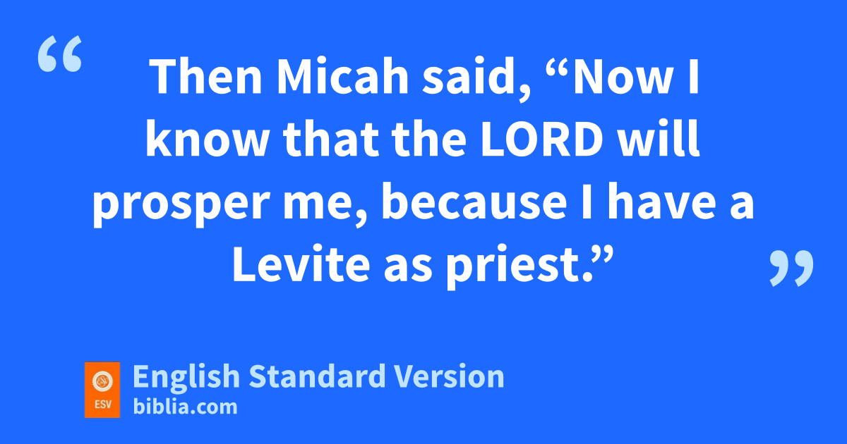 7 Now there was a young man of dBethlehem in Judah, of the family of Judah, who was a Levite, and he sojourned there. 8 And the man departed from the town of Bethlehem in Judah to sojourn where he could find a place. And as he journeyed, he came to ethe hill country of Ephraim to the house of Micah. 9 And Micah said to him, “Where do you come from?” And he said to him, “I am a Levite of Bethlehem in Judah, and I am going to sojourn where I may find a place.” 10 And Micah said to him, “Stay with me, and be to me fa father and a priest, and I will give you ten pieces of silver a year and a suit of clothes and your living.” And the Levite went in. 11 And the Levite gwas content to dwell with the man, and the young man became to him like one of his sons. 12 And Micah hordained the Levite, and the young man ibecame his priest, and was in the house of Micah. 13 Then Micah said, “Now I know that the Lord will prosper me, because I have a Levite as priest.”