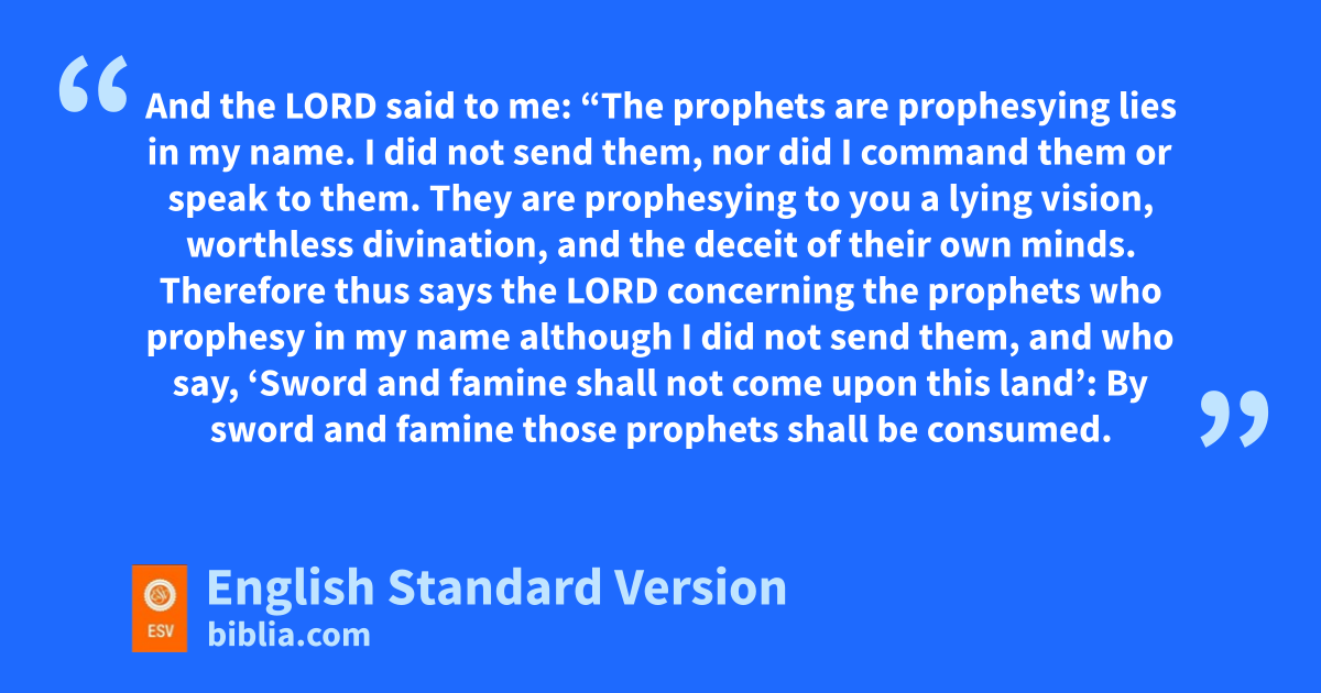13 Then I said: “Ah, Lord God, behold, the prophets usay to them, ‘You shall not see the sword, nor shall you have famine, but I will give you assured peace in this place.’ ” 14 And the Lord said to me: “The vprophets are prophesying lies in my name. wI did not send them, nor did I command them or speak to them. They are prophesying to you a lying vision, xworthless divination, and ythe deceit of their own minds. 15 Therefore thus says the Lord concerning the prophets who prophesy in my name although wI did not send them, and who say, t‘Sword and famine shall not come upon this land’: zBy sword and famine those prophets shall be consumed. 16 And the people to whom they prophesy shall be cast out in the streets of Jerusalem, victims of famine and sword, awith none to bury them—them, their wives, their sons, and their daughters. For I will pour out their evil upon them.