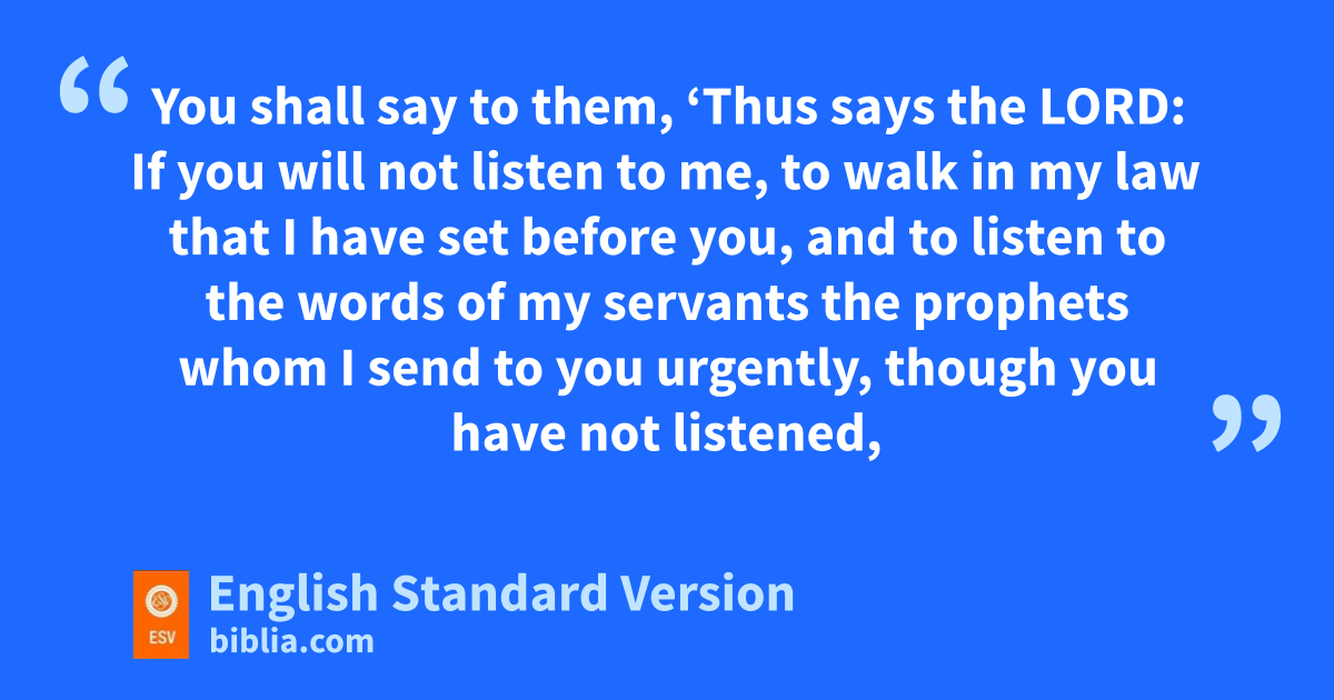 26 tIn the beginning of the reign of uJehoiakim the son of Josiah, king of Judah, this word came from the Lord: 2 “Thus says the Lord: vStand in the court of the Lord’s house, and speak to all the cities of Judah that come to worship in the house of the Lord wall the words that I command you to speak to them; xdo not hold back a word. 3 yIt may be they will listen, and every one turn from his evil way, zthat I may relent of the disaster that I intend to do to them abecause of their evil deeds. 4 You shall say to them, ‘Thus says the Lord: bIf you will not listen to me, to walk in my law that I have set before you, 5 cand to listen to the words of my servants the prophets whom I send to you curgently, cthough you have not listened, 6 then I will make this house dlike Shiloh, and I will make this city ea curse for all the nations of the earth.’ ”