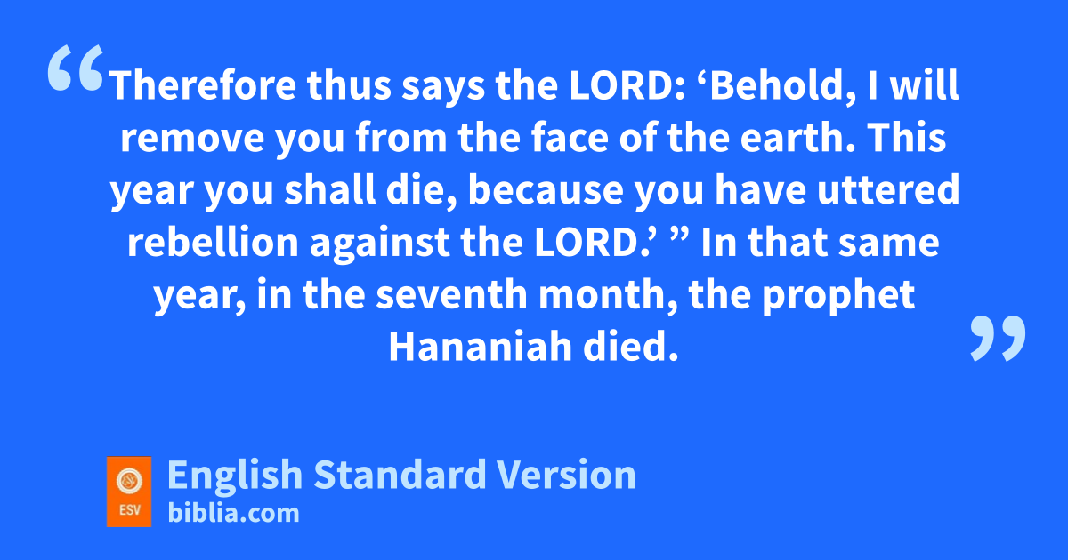 12 Sometime after the prophet bHananiah had broken the yoke-bars from off the neck of Jeremiah the prophet, the word of the Lord came to Jeremiah: 13 “Go, tell Hananiah, ‘Thus says the Lord: You have broken wooden bars, but you have made in their place bars of iron. 14 For thus says the Lord of hosts, the God of Israel: I have put upon the neck of all these nations can iron yoke to serve Nebuchadnezzar king of Babylon, dand they shall serve him, efor I have given to him even the beasts of the field.’ ” 15 And Jeremiah the prophet said to the prophet Hananiah, “Listen, Hananiah, fthe Lord has not sent you, gand you have made this people trust in a lie. 16 Therefore thus says the Lord: ‘Behold, I will remove you from the face of the earth. This year you shall die, hbecause you have uttered rebellion against the Lord.’ ”