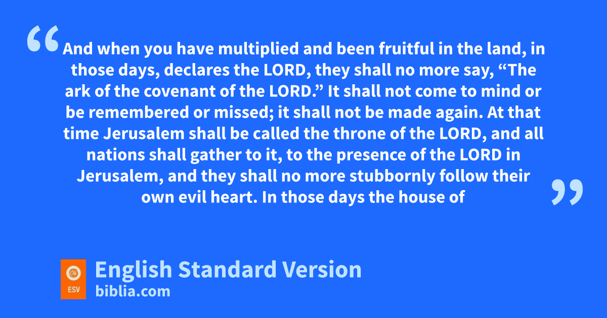 15 “ ‘And gI will give you shepherds after my own heart, hwho will feed you with knowledge and understanding. 16 And when you have multiplied and been fruitful in the land, in those days, declares the Lord, they shall no more say, “The ark of the covenant of the Lord.” It shall not come to mind or be remembered or missed; it shall not be made again. 17 At that time Jerusalem shall be called the throne of the Lord, iand all nations shall gather to it, jto the presence of the Lord in Jerusalem, and they shall no more stubbornly follow their own evil heart. 18 kIn those days the house of Judah shall join the house of Israel, and together they shall come from the land lof the north to mthe land that I gave your fathers for a heritage.