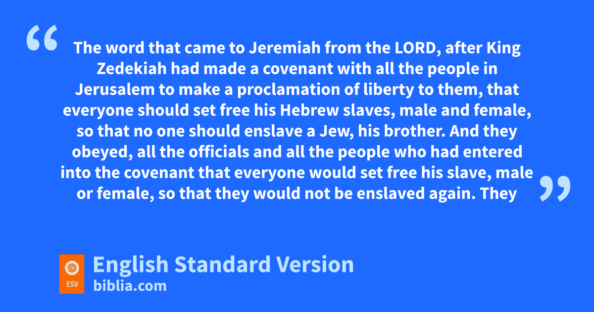 8 The word that came to Jeremiah from the Lord, after King Zedekiah phad made a covenant with all the people in Jerusalem qto make a proclamation of liberty to them, 9 rthat everyone should set free his Hebrew slaves, male and female, sso that no one should enslave a Jew, his brother. 10 And they obeyed, all the officials and all the people who had entered into the covenant that everyone would set free his slave, male or female, so that they would not be enslaved again. They obeyed and set them free. 11 But afterward they turned around and took back the male and female slaves rthey had set free, and brought them into subjection as slaves. 12 The word of the Lord came to Jeremiah from the Lord: 13 “Thus says the Lord, the God of Israel: I myself made a covenant with your fathers when tI brought them out of the land of Egypt, out of the house of slavery, saying, 14 u‘At the end of seven years each of you must set free the fellow Hebrew who has been sold to you and has served you six years; ryou must set him free from your service.’ But vyour fathers did not listen to me or incline their ears to me. 15 You recently repented and did what was right in my eyes qby proclaiming liberty, each to his neighbor, and wyou made a covenant before me in the xhouse that is called by my name, 16 but then you turned around yand profaned my name when each of you took back his male and female slaves, zwhom you had set free according to their desire, and you brought them into subjection to be your slaves.
