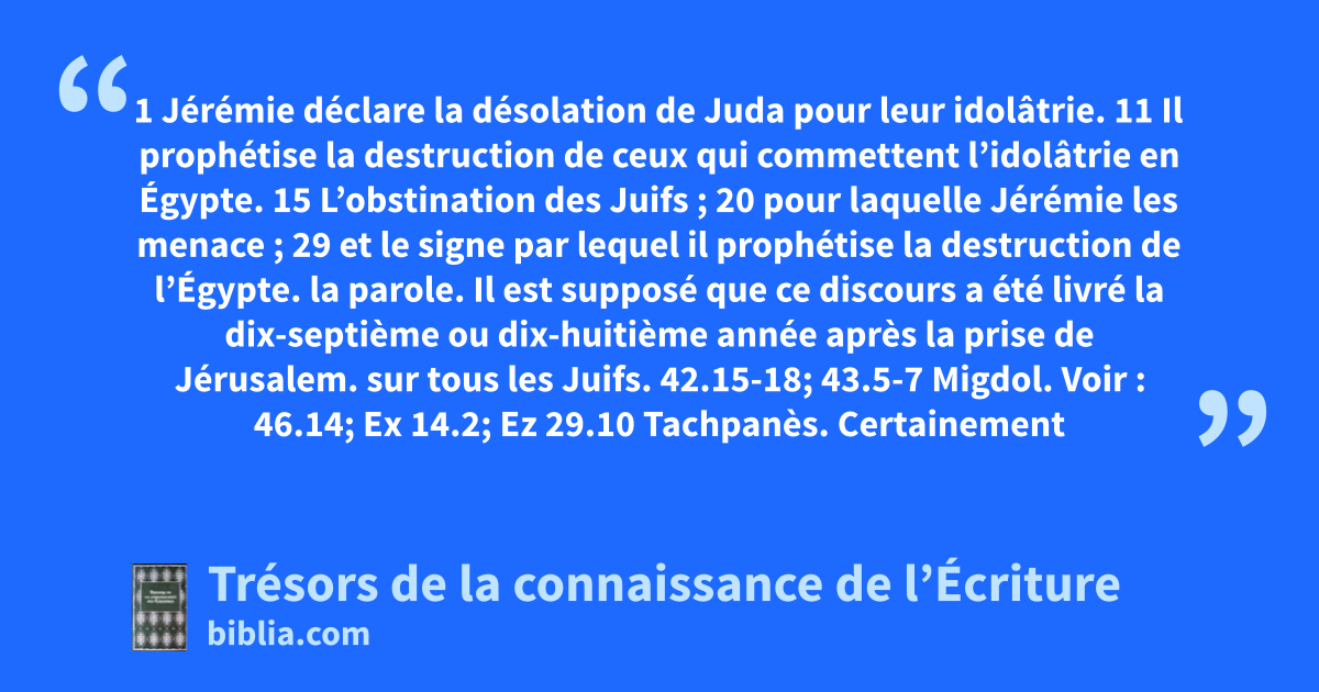 la parole. Il est supposé que ce discours a été livré la dix-septième ou dix-huitième année après la prise de Jérusalem. sur tous les Juifs. 42.15-18; 43.5-7 Migdol. Voir : 46.14; Ex 14.2; Ez 29.10 Tachpanès. Certainement une ville royale de la Basse Égypte. Elle semble avoir été la première ville d’Égypte, sur la route de la Palestine. C’est en ce lieu que la tradition raconte que le fidèle Jérémie fut lapidé à mort par ceux pour lesquels il avait veillé, prié, et souffert toutes sortes d’indignités. 43.7; Ez 30.18 Noph. 2.16; 46.14, 19; Es 19.13; Ez 30.16 Pathros. Gn 10.14 Patrusim. Es 11.11; Ez 29.14; 30.14