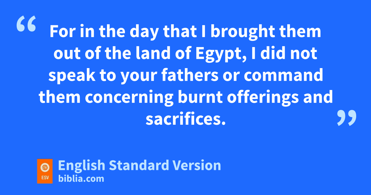21 Thus says the Lord of hosts, the God of Israel: p“Add your burnt offerings to your sacrifices, and eat the flesh. 22 For in the day that I brought them out of the land of Egypt, I did not speak to your fathers or command them qconcerning burnt offerings and sacrifices. 23 But this command I gave them: r‘Obey my voice, and sI will be your God, and you shall be my people. tAnd walk in all the way that I command you, uthat it may be well with you.’ 24 vBut they did not obey or incline their ear, wbut walked in their own counsels and xthe stubbornness of their evil hearts, and ywent backward and not forward. 25 From the day that your fathers came out of the land of Egypt to this day, zI have persistently sent all my servants the prophets to them, day after day. 26 vYet they did not listen to me or incline their ear, abut stiffened their neck. bThey did worse than their fathers.