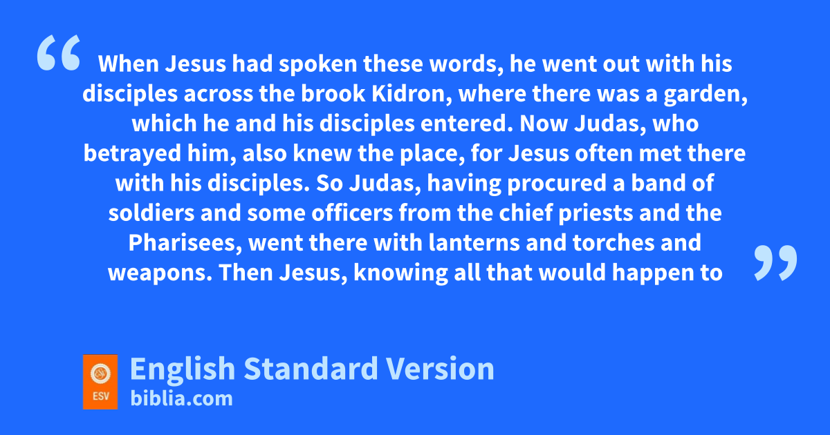 18 When Jesus had spoken these words, nhe went out with his disciples across othe brook Kidron, where there was a garden, which he and his disciples entered. 2 Now Judas, who betrayed him, also knew pthe place, for qJesus often met there with his disciples. 3 rSo Judas, having procured a band of soldiers and some officers from the chief priests and the Pharisees, went there with lanterns and torches and weapons. 4 Then Jesus, sknowing all that would happen to him, came forward and said to them, t“Whom do you seek?” 5 They answered him, “Jesus of Nazareth.” Jesus said to them, “I am he.”1 Judas, who betrayed him, was standing with them. 6 uWhen Jesus2 said to them, “I am he,” they drew back and fell to the ground. 7 So he asked them again, t“Whom do you seek?” And they said, “Jesus of Nazareth.” 8 Jesus answered, “I told you that I am he. So, if you seek me, let these men go.” 9 vThis was to fulfill the word that he had spoken: “Of those whom you gave me I have lost not one.” 10 Then Simon Peter, whaving a sword, drew it and struck the high priest’s servant3 and cut off his right ear. (The servant’s name was Malchus.) 11 So Jesus said to Peter, “Put your sword into its sheath; xshall I not drink the cup that the Father has given me?”