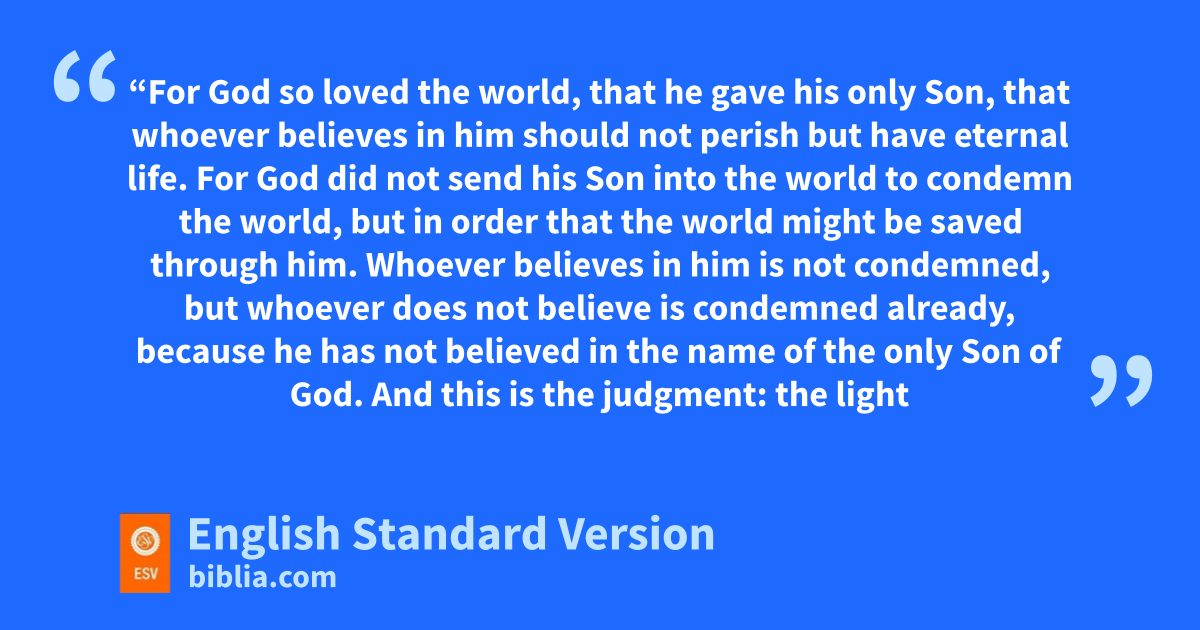 16 “For hGod so loved ithe world,9 jthat he gave his only Son, that whoever believes in him should not kperish but have eternal life. 17 For lGod did not send his Son into the world mto condemn the world, but in order that the world might be saved through him. 18 nWhoever believes in him is not condemned, but whoever does not believe is condemned already, because he has not obelieved in the name of the only Son of God. 19 pAnd this is the judgment: qthe light has come into the world, and rpeople loved the darkness rather than the light because stheir works were evil. 20 tFor everyone who does wicked things hates the light and does not come to the light, ulest his works should be exposed. 21 But whoever vdoes what is true wcomes to the light, so that it may be clearly seen that his works have been carried out in God.”