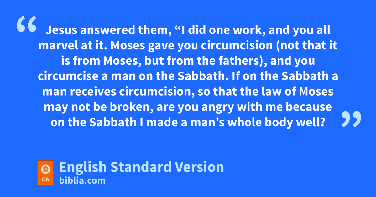 14 About the middle of the feast Jesus went up hinto the temple and began teaching. 15 The Jews therefore imarveled, saying, “How is it that this man has learning,4 when he has never studied?” 16 So Jesus answered them, j“My teaching is not mine, but his kwho sent me. 17 lIf anyone’s will is to do God’s5 will, mhe will know whether the teaching is from God or whether I nam speaking on my own authority. 18 The one who speaks on his own authority oseeks his own glory; but the one who seeks the glory of him who sent him is true, and in him there is no falsehood. 19 pHas not Moses given you the law? Yet none of you keeps the law. qWhy do you seek to kill me?” 20 The crowd answered, r“You have a demon! Who is seeking to kill you?” 21 Jesus answered them, “I did sone work, and you all marvel at it. 22 tMoses gave you circumcision (not that it is from Moses, but ufrom the fathers), and you circumcise a man on the Sabbath. 23 If on the Sabbath a man receives circumcision, so that the law of Moses may not be broken, vare you angry with me because on the Sabbath I made a man’s whole body well? 24 wDo not judge by appearances, but judge with right judgment.”