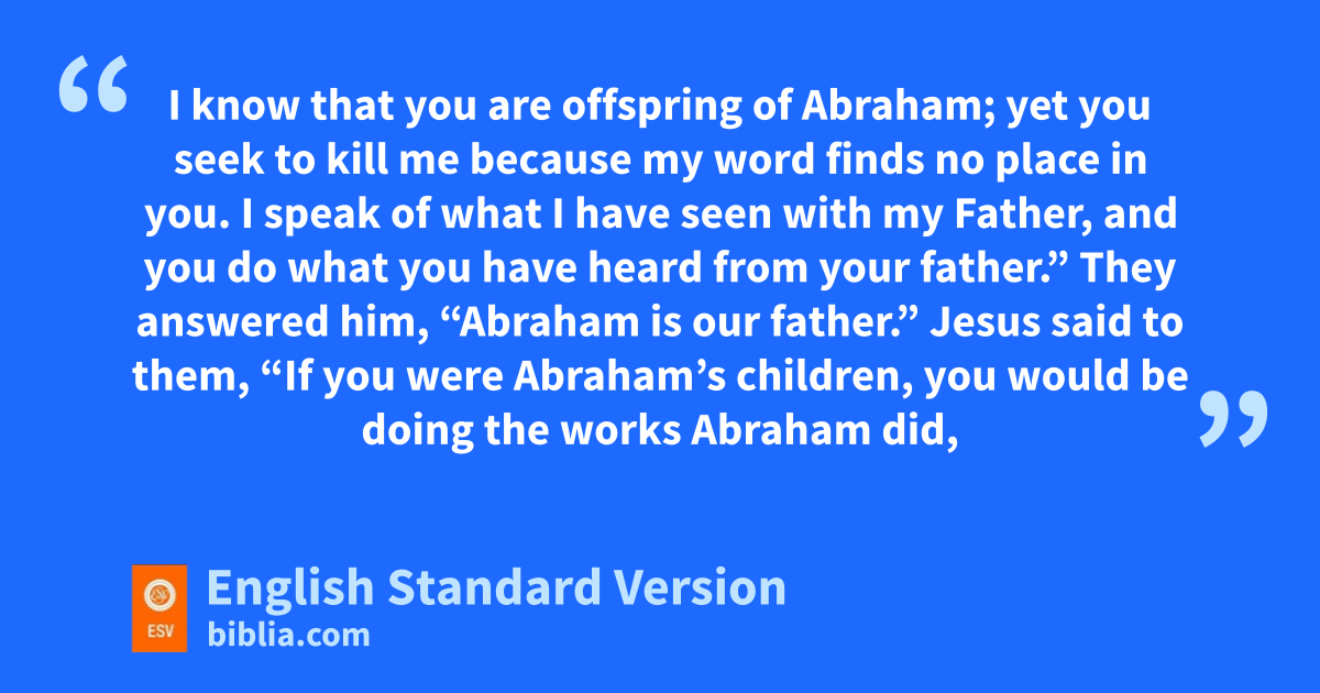 39 They answered him, m“Abraham is our father.” Jesus said to them, n“If you were Abraham’s children, you would be doing the works Abraham did, 40 but now oyou seek to kill me, a man who has told you the truth pthat I heard from God. This is not what Abraham did. 41 You are doing the works your father did.” They said to him, q“We were not born of sexual immorality. We have rone Father—even God.” 42 Jesus said to them, s“If God were your Father, you would love me, for tI came from God and uI am here. vI came not of my own accord, but whe sent me. 43 xWhy do you not understand what I say? It is because you cannot ybear to hear my word. 44 zYou are of your father the devil, and your will is to do your father’s desires. aHe was a murderer from the beginning, and bdoes not stand in the truth, because there is no truth in him. cWhen he lies, he speaks out of his own character, for he is a liar and the father of lies. 45 But because I tell the truth, you do not believe me. 46 Which one of you convicts me of sin? If I tell the truth, why do you not believe me? 47 dWhoever is of God hears the words of God. eThe reason why you do not hear them is that fyou are not of God.”