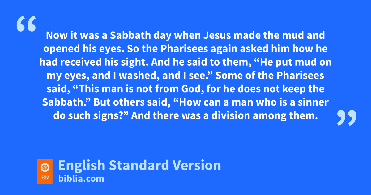 13 They brought to the Pharisees the man who had formerly been blind. 14 qNow it was a Sabbath day when Jesus made the mud and opened his eyes. 15 rSo the Pharisees again asked him how he had received his sight. And he said to them, “He put mud on my eyes, and I washed, and I see.” 16 Some of the Pharisees said, “This man is not sfrom God, tfor he does not keep the Sabbath.” But others said, u“How can a man who is a sinner do such signs?” And vthere was a division among them. 17 So they said again to the blind man, “What do you say about him, since he has opened your eyes?” He said, w“He is a prophet.”
