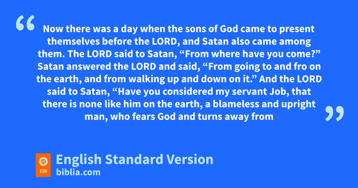 6 Now there was a day when kthe sons of God came to present themselves before the Lord, and lSatan2 also came among them. 7 The Lord said to Satan, “From where have you come?” Satan answered the Lord and said, “From mgoing to and fro on the earth, and from walking up and down on it.” 8 And the Lord said to Satan, “Have you nconsidered my oservant Job, that there is none like him on the earth, pa blameless and upright man, who fears God and turns away from evil?” 9 Then Satan answered the Lord and said, “Does Job fear God for no reason? 10 Have you not put qa hedge around him and his house and all that he has, on every side? You have rblessed the work of his hands, and his possessions have increased in the land. 11 But sstretch out your hand and ttouch all that he has, and he will ucurse you vto your face.” 12 And the Lord said to Satan, “Behold, all that he has is in your hand. Only against him do not stretch out your hand.” So Satan went out from the presence of the Lord.
